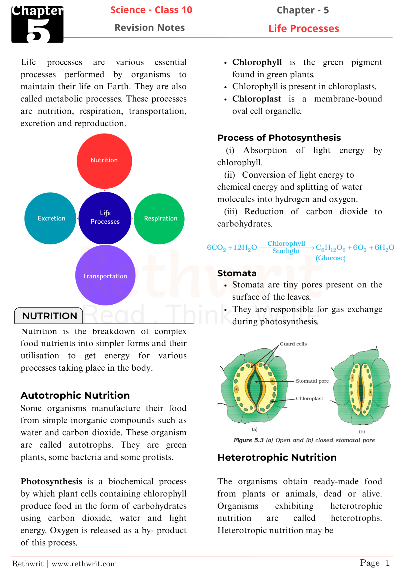 Quick‑revision PDF notes for Class 10 Science Chapter 5 Life Processes—covers nutrition, respiration, transport, excretion with clear diagrams, definitions & exam tips.